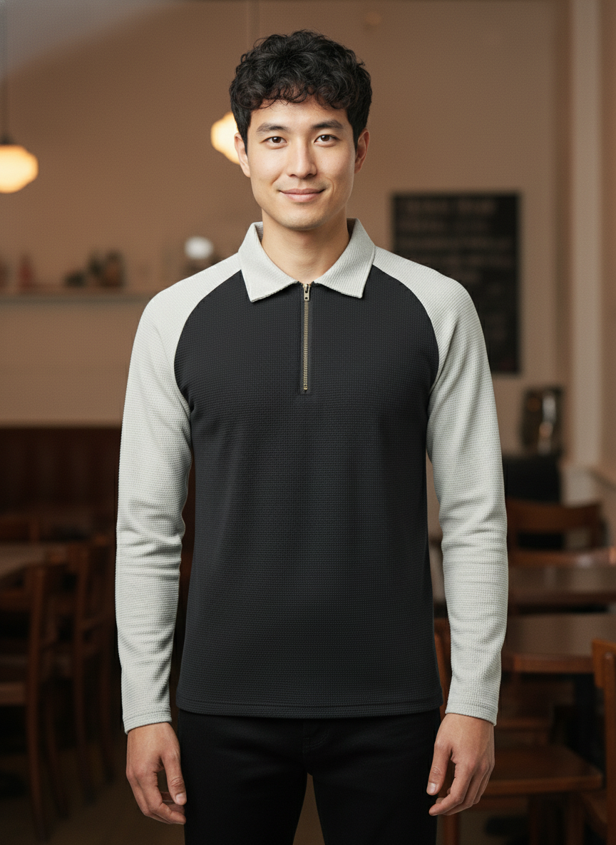 • T-shirt Style: A smart-casual style with a quarter-zip front and a classic collar. The body and sleeves are different colors for a trendy, bold look.