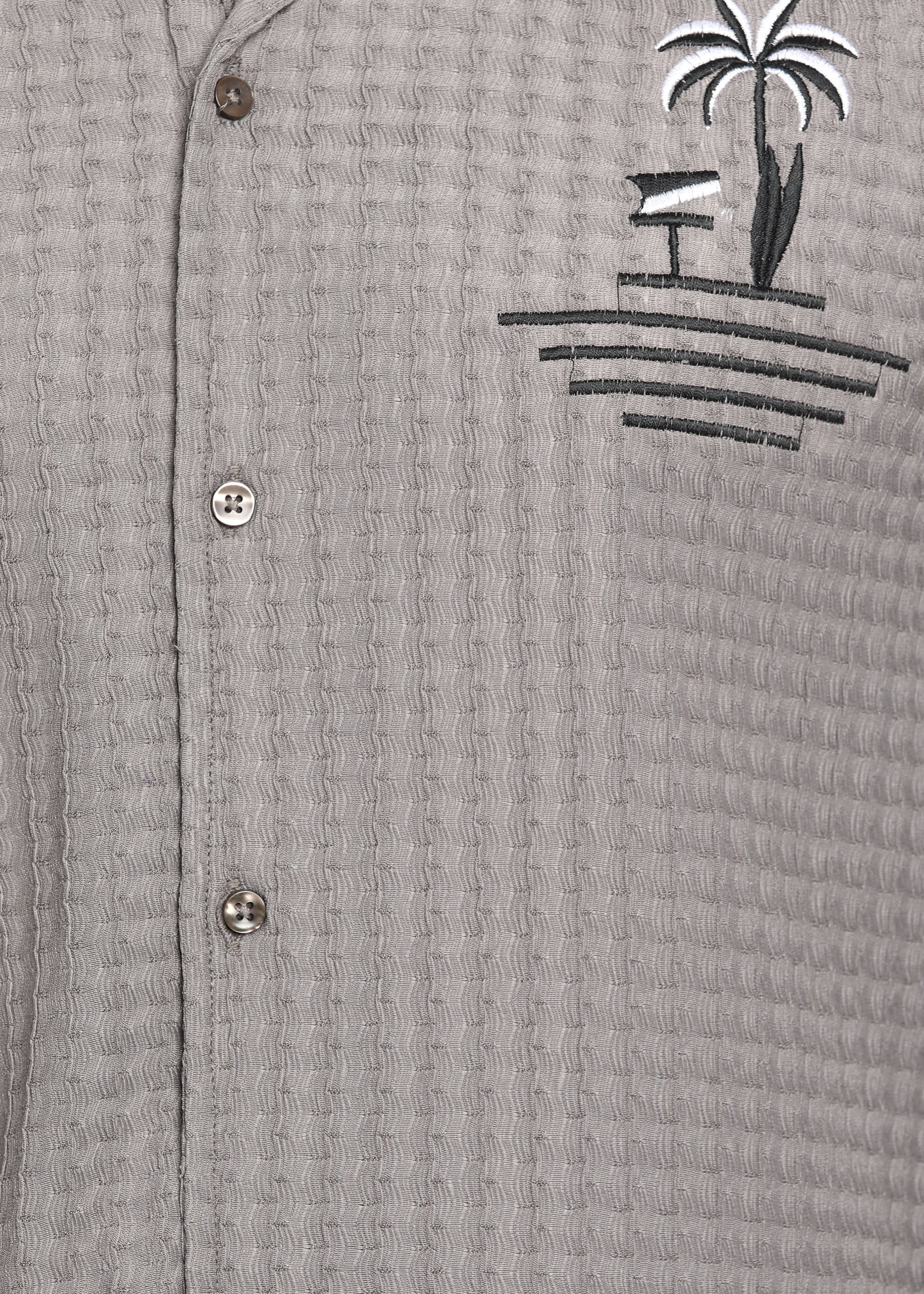 • Men’s Grey Textured Seersucker Cuban Collar Shirt with Palm Embroidery