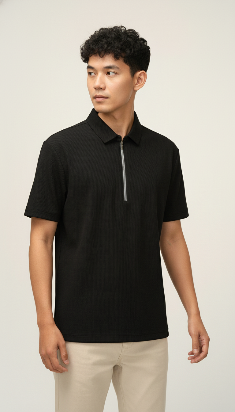 https://indiclub.shop/products/men-s-jet-black-textured-ribbed-zip-polo-t-shirt
