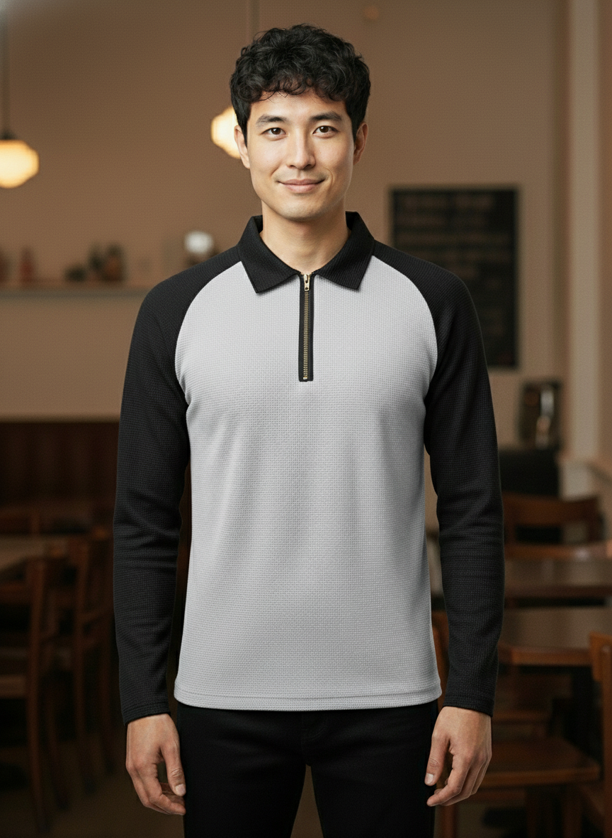 https://indiclub.shop/products/men-s-light-gray-black-waffle-knit-quarter-zip-long-sleeve-polo-t-shirt