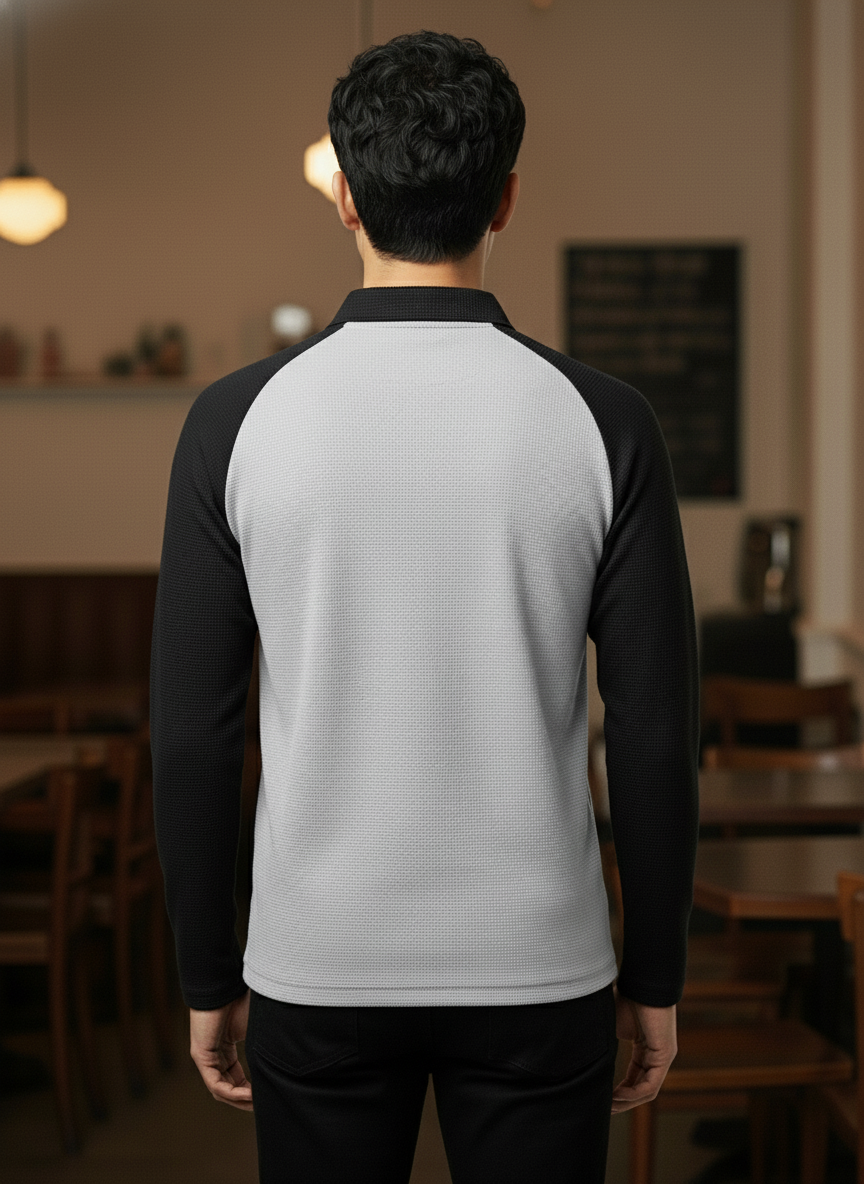 Product Overview Upgrade your casual look with this modern long-sleeve polo t-shirt. It features a unique waffle texture and a stylish two-tone design. Available in 5 distinct color combinations (including Black/Grey, Brown/Black, Grey/Black, and Maroon/Black), this t-shirt is perfect for looking sharp while staying comfortable.