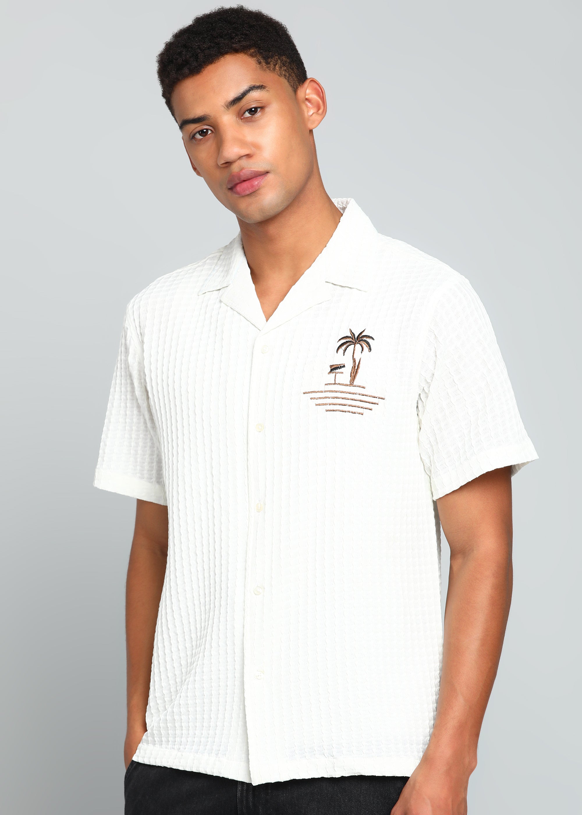 • Men’s White Textured Seersucker Cuban Collar Shirt with Palm Embroidery