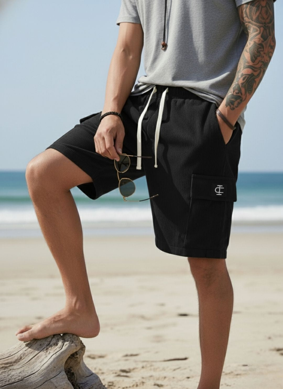 Elevate your casual wardrobe with our Men's Ribbed Cargo Shorts, designed for the modern trendsetter. Crafted from high-quality Polyester Ribbed fabric, these shorts offer a unique vertical texture that combines durability with a soft, comfortable touch. Featuring a relaxed fit, an adjustable drawstring elastic waistband, and signature side cargo pockets with the distinct logo patch, these shorts are perfect for beach days, streetwear styling, or lounging.