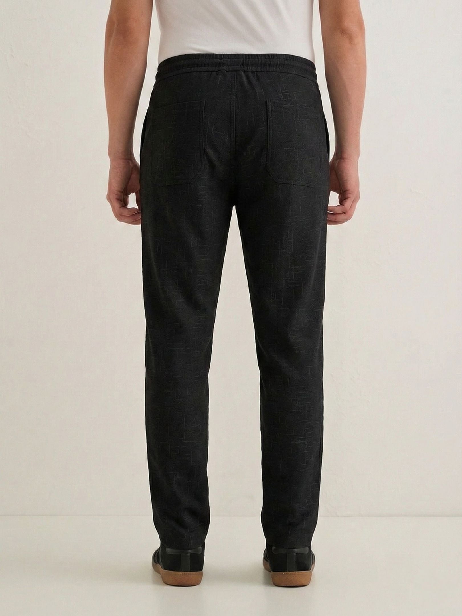 Men's Black Textured Relaxed Fit Trousers with Elasticated Drawstring Waist