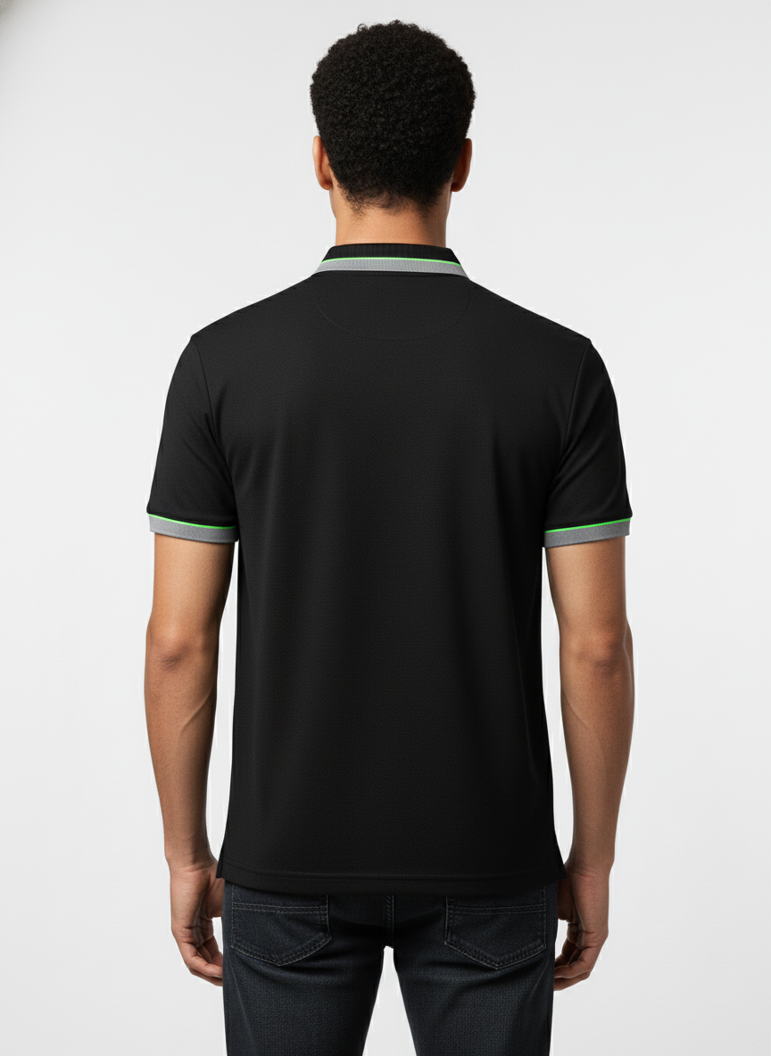 • Men's Black Textured Zip-Polo T-Shirt with Neon Collar Accent