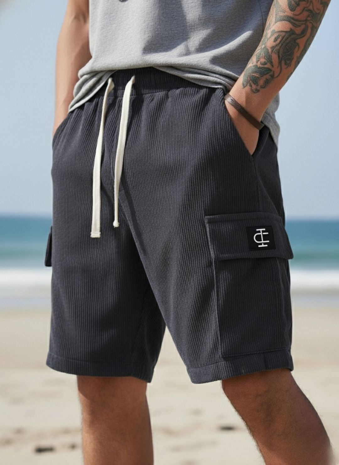 Elevate your casual wardrobe with our Men's Ribbed Cargo Shorts, designed for the modern trendsetter. Crafted from high-quality Polyester Ribbed fabric, these shorts offer a unique vertical texture that combines durability with a soft, comfortable touch. Featuring a relaxed fit, an adjustable drawstring elastic waistband, and signature side cargo pockets with the distinct logo patch, these shorts are perfect for beach days, streetwear styling, or lounging.