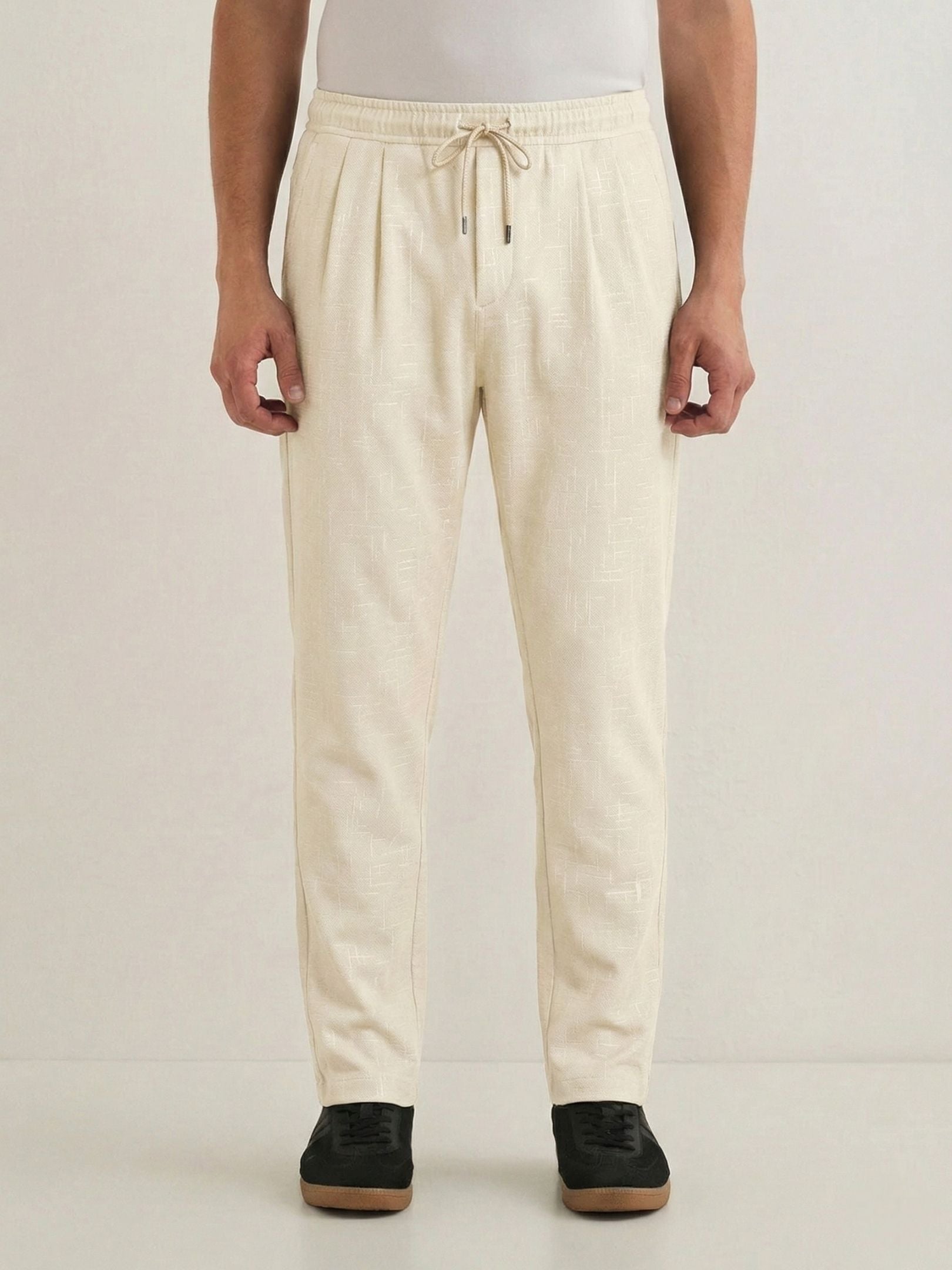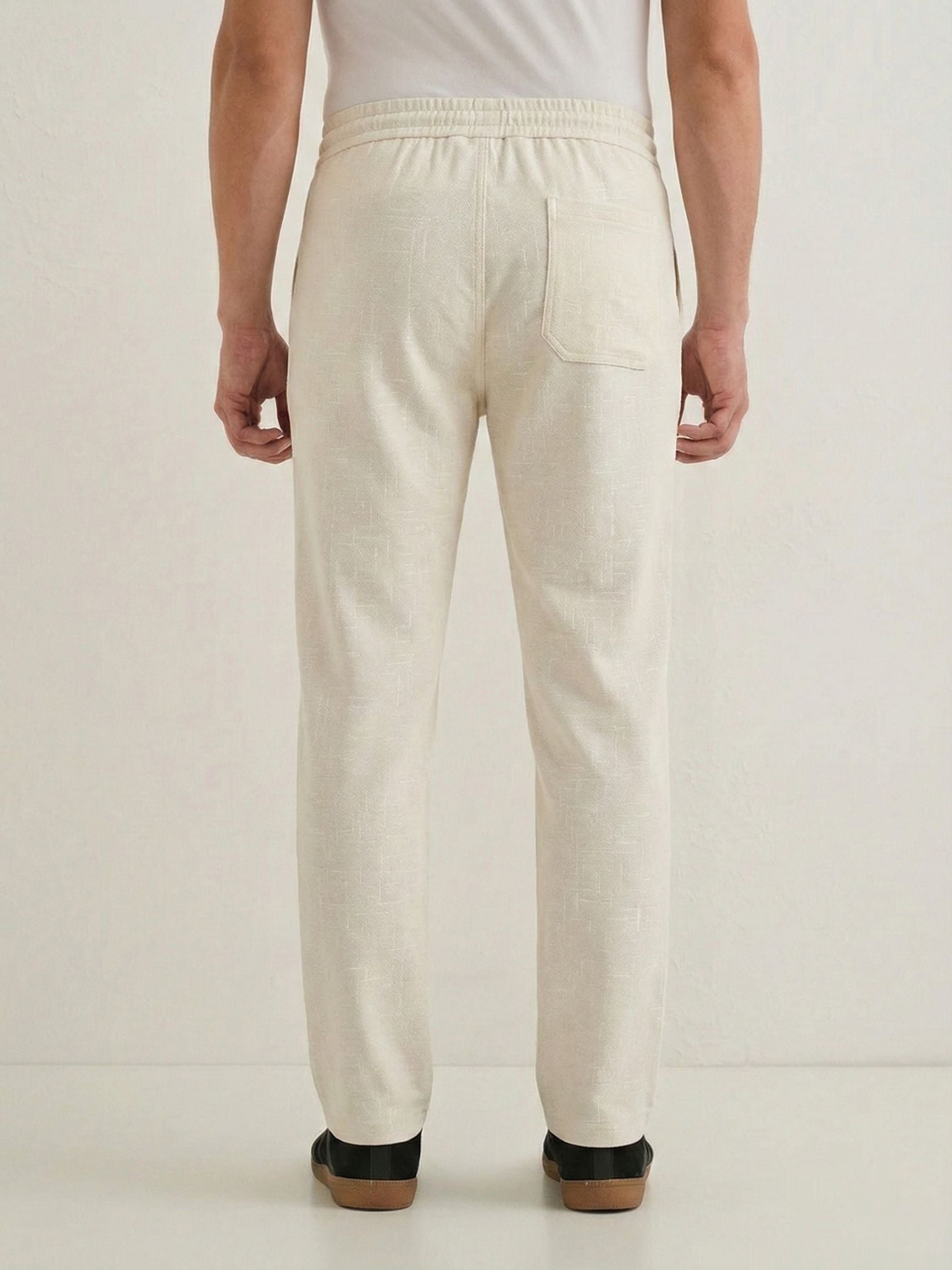 Men's Cream Textured Relaxed Fit Trousers with Elasticated Drawstring Waist