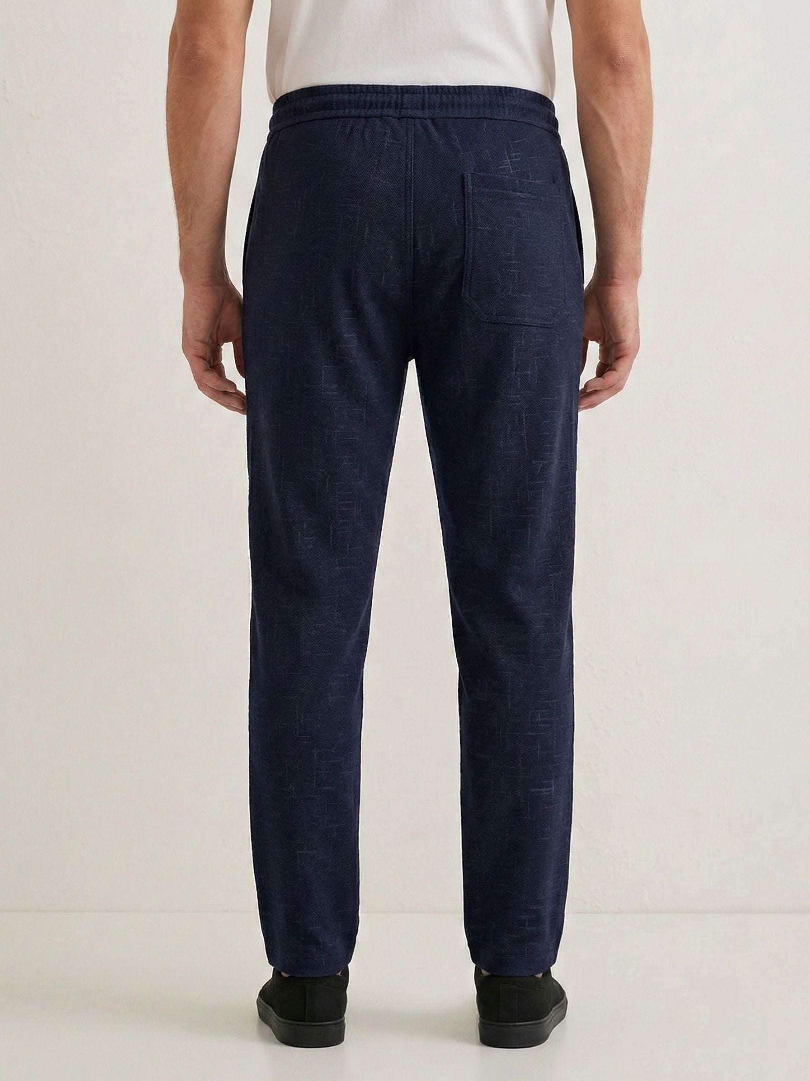 Men's Navy Blue Textured Relaxed Fit Trousers with Elasticated Drawstring Waist