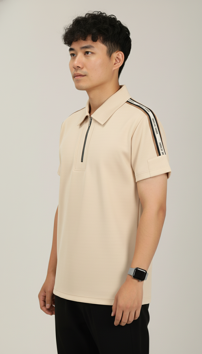 • Men's Sand Beige Premium Shoulder-Stripe Zip Polo T-Shirt
