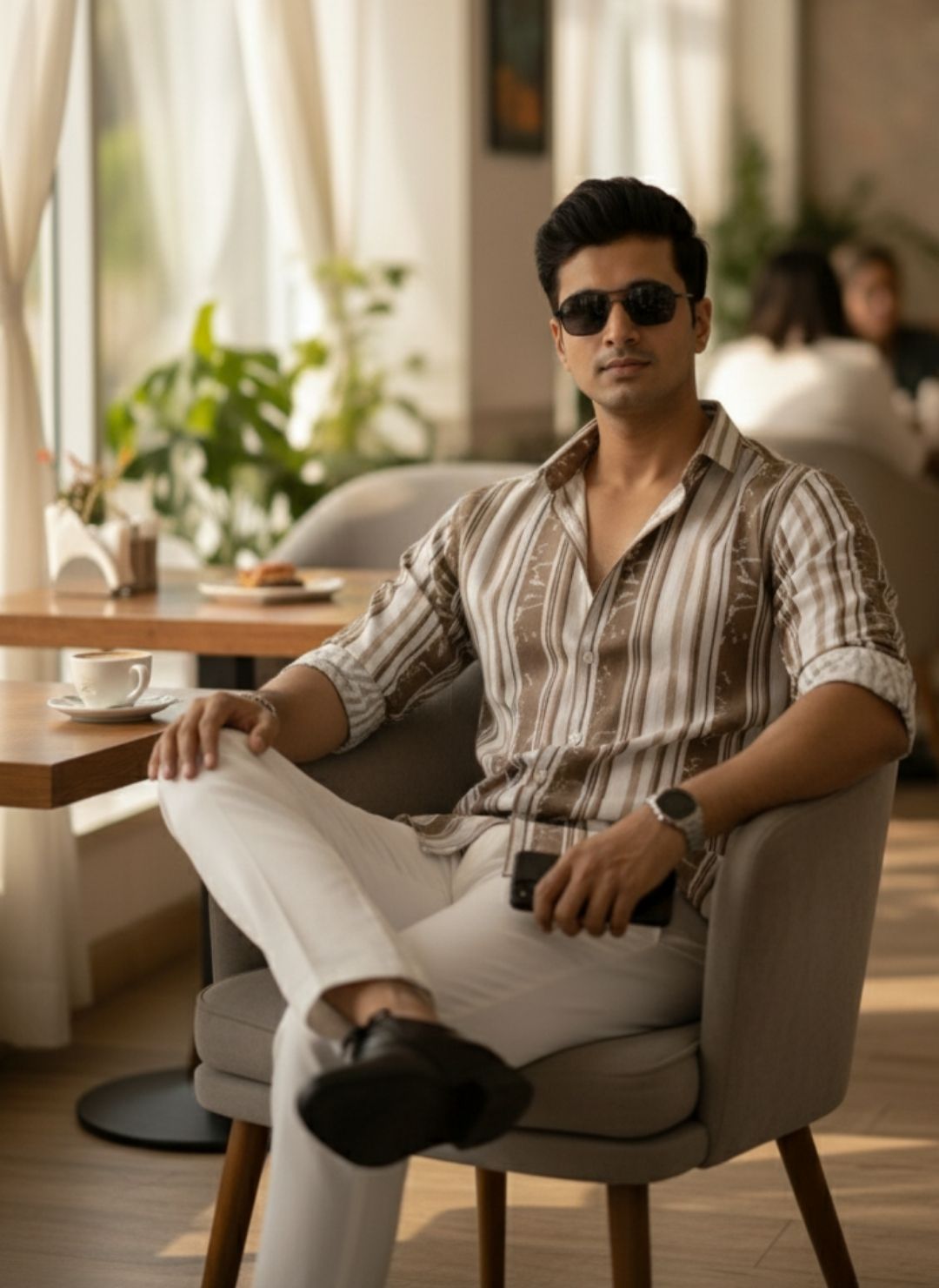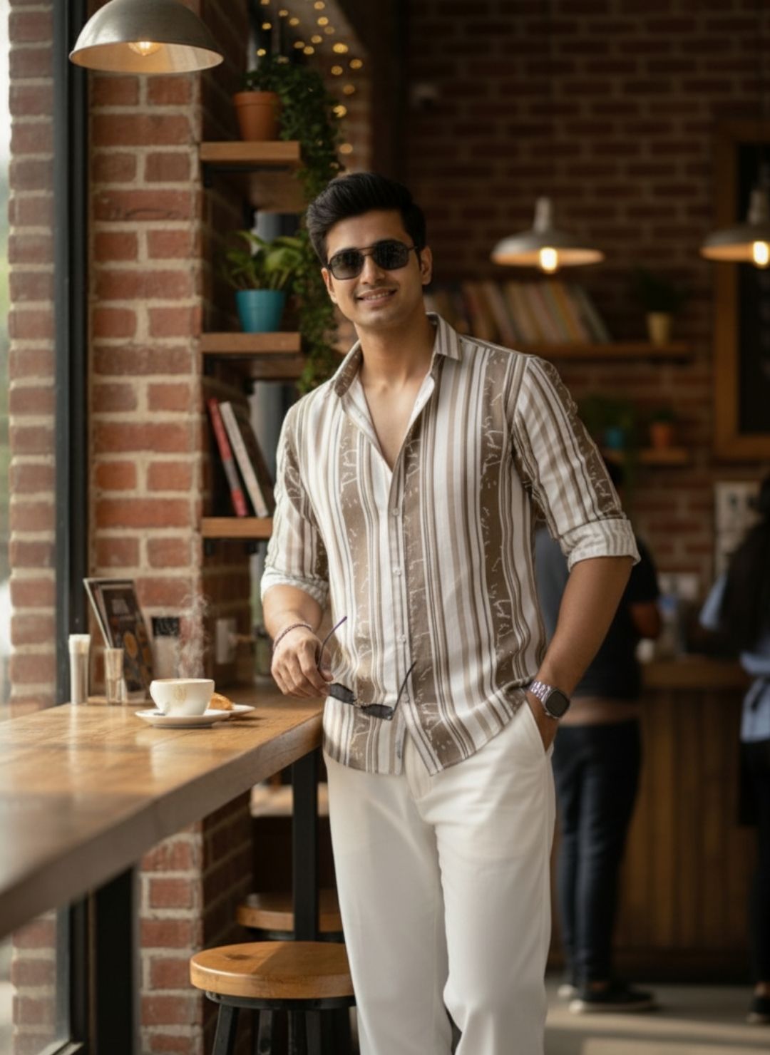 Men's Sand Beige Textured Multi-Color Striped